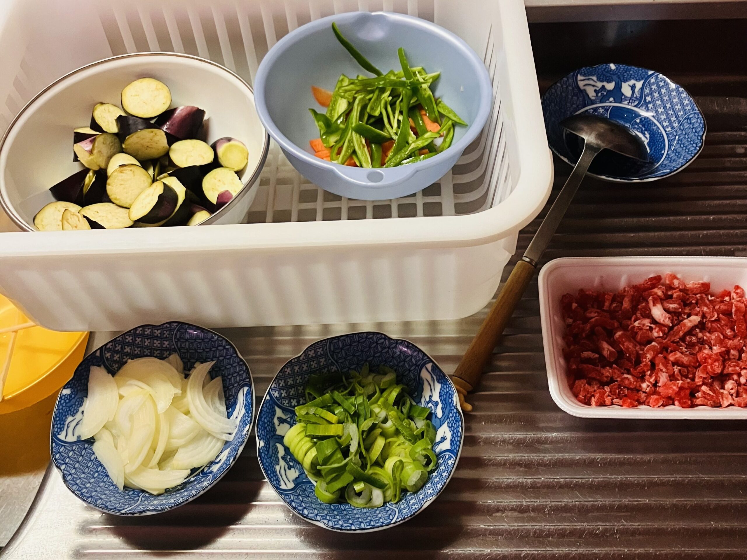 そのためには段取りが大切だとだんだんわかってきました。例えば下部の写真は麻婆茄子の段取り